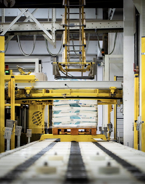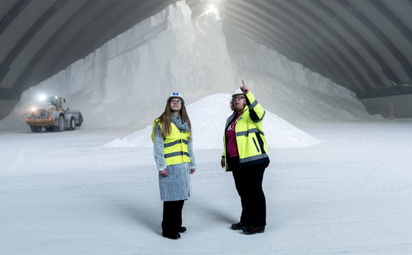 Die Trocknerhalle ist die neueste Investition, die Salinen Austria getätigt hat. Bis 2030 will das Unternehmen weitere 200 Mio. € aufwenden, vor allem, um die Energieinfrastruktur zu verbessern und mehr Salztabletten produzieren zu können. Die Tabletten, die Haushalts- und Gewerbegeräte vor Kalk schützen, böten gemeinsam mit den Pharmasalzen (Salze für pharmazeutische, medizinische und wissenschaftliche Zwecke) das größte Potenzial am Markt. Das Geschäft mit Streusalz sei hingegen immer schlechter planbar, da das Wetter unvorhersehbarer wird. Das erzählt Herzog, während wir – begleitet von ihrer Assistentin sowie der Pressebeauftragten des Unternehmens – vorbei an laut arbeitenden Maschinen und den meterhohen Salztanks wandern. Helm und Warnweste sind Pflicht; das erklärt sich spätestens, als wir zur Salzlagerhalle gelangen.