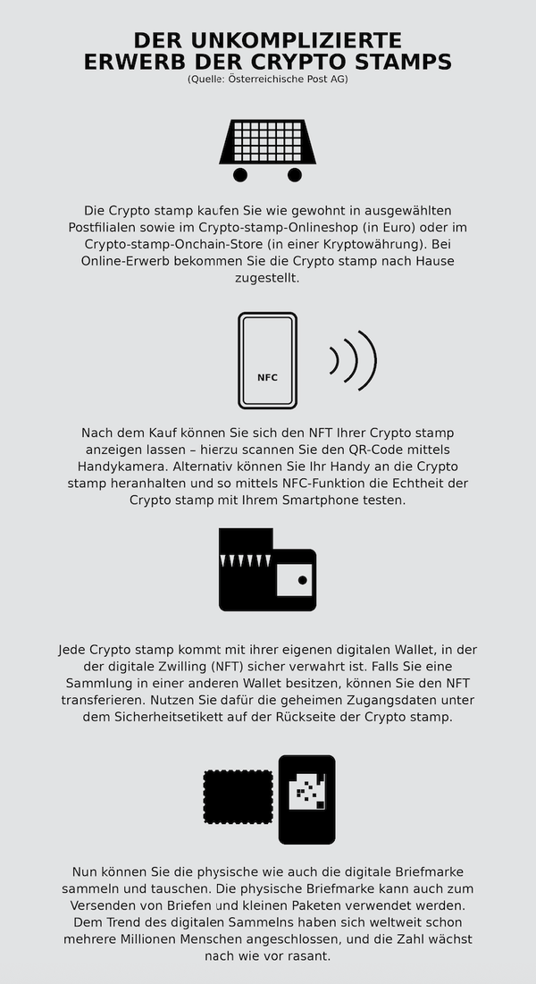 Der Einstieg ist bewusst niederschwellig: Ob in der Postfiliale oder im Onlineshop, mit Euro oder Kryptowährung – der Kauf bleibt unkompliziert. Die physische Briefmarke kann sofort mitgenommen oder zugestellt werden, der digitale Zwilling landet in der mitgelieferten Wallet („digitales Sammelalbum“) oder lässt sich in eine bestehende Wallet übertragen. Diese Zugänglichkeit ermöglicht, dass sowohl digitale „Crypto-Natives“ als auch klassische Philatelist*innen Teil der Crypto-stamp-Community werden.